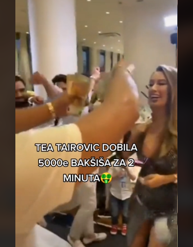 Ovoga puta Tea je izvodila svoju pesmu dok je zavodljivo mešala u uskoj haljini, a jedan gost je bacao pare po njoj. On nije žalio para, te su svuda po sali letele novčanice od 50, 100 i 200 evra, a pevačica se nije zaustavljala.