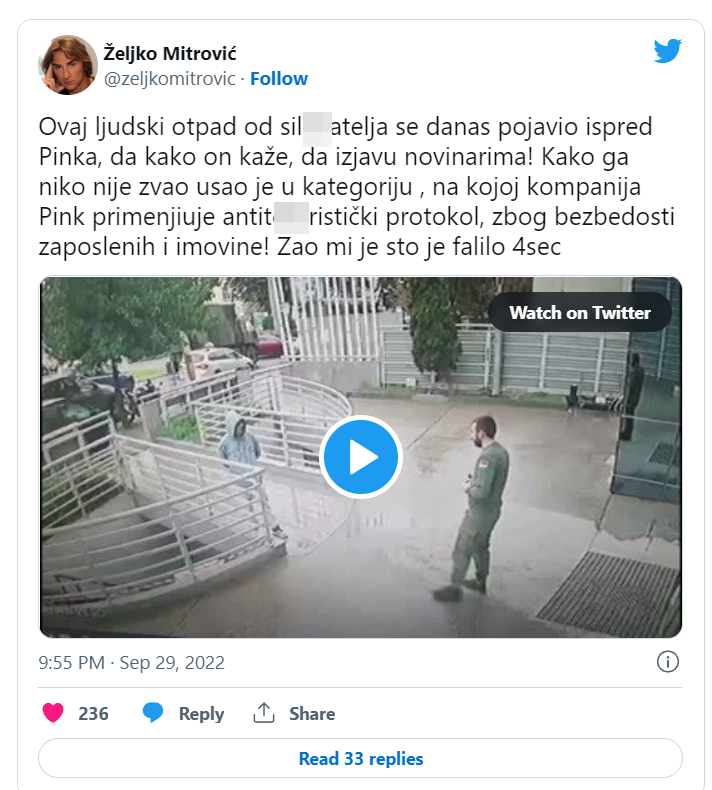 Vlasnik “Pinka”, Željko Mitrović, objavio je na svom Tviteru snimak sa nadzornih kamera ispred televizije “Pink” na kojem obezbeđenje tera sil..atelja Igora Miloševića.