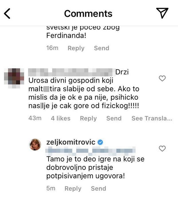 – Drži Uroša, divni gospodin koji malt..tira slabije od sebe. Ako to misliš da je ok, e pa nije, psihičko nas.lje je čak gore od fizičkog!!! – napisala je jedna korisnica društvene mreže Instagram, na šta joj je vlasnik Pink televizije odgovorio: