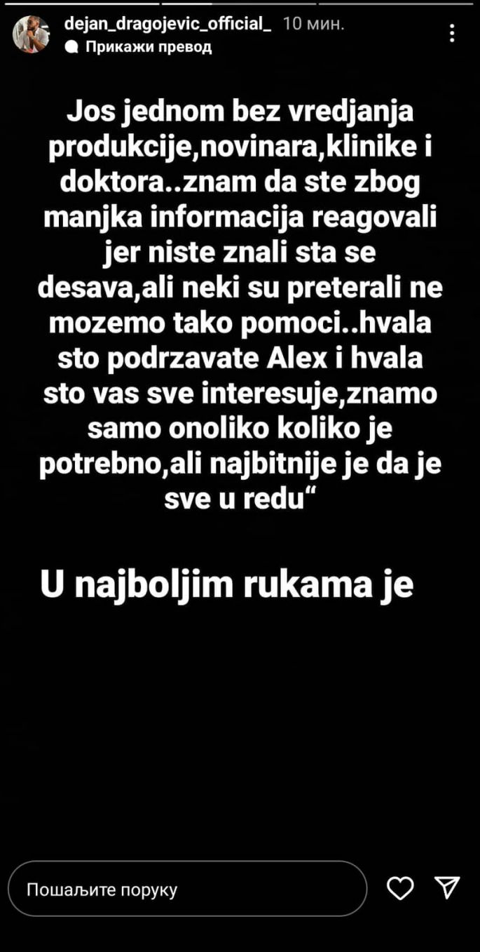 Tim povodom se oglasio Dejan kako bi smirio sve one koi brinu o zdravstvenom stanju njegove devojke, pa su počeli da vređaju pripadnike sedme sile, produkciju, pa čak i bolnicu u kojoj je operisana.