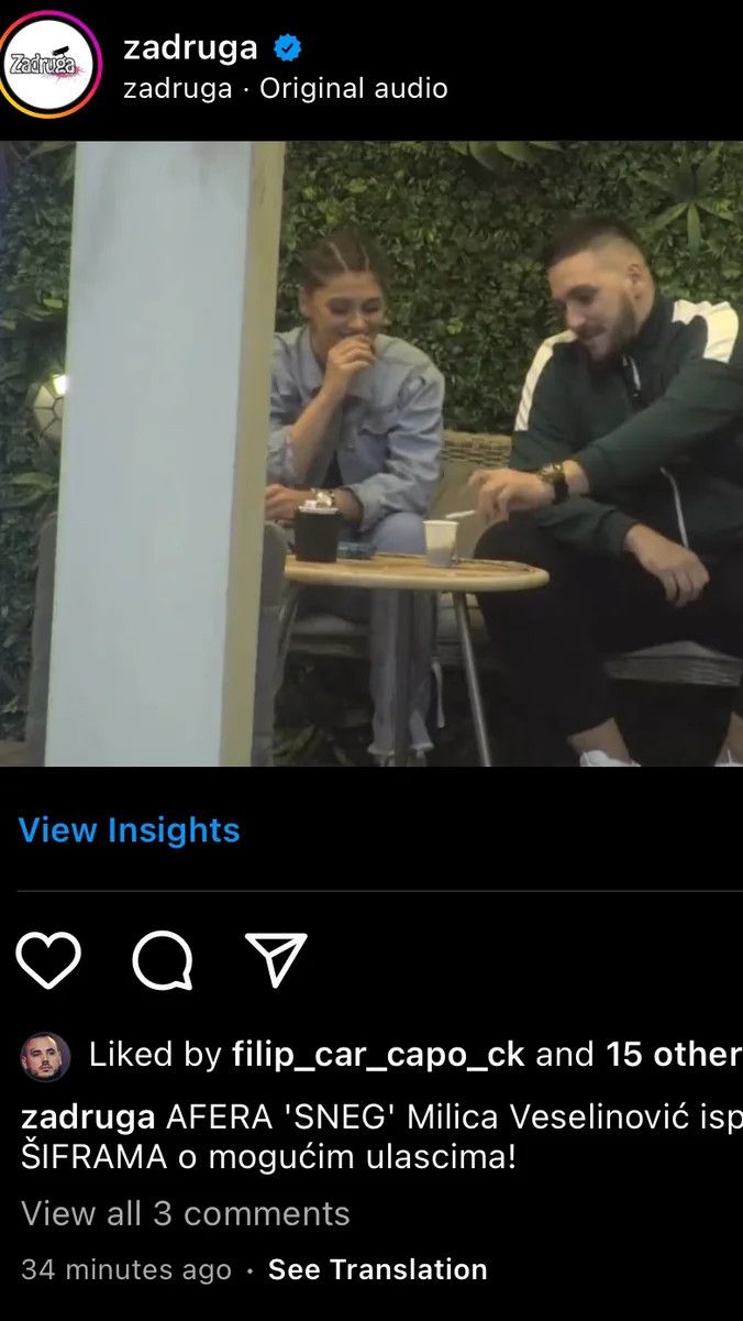 Na društvenim mrežama su se odmah pokrenuli komentari da se ona raspitivala za Filipa Cara, a dodatne sumnje podgrejao je baš Car, koji je ovo objavu lajkovao na zvaničnom Instagram profilu “Zadruge”.