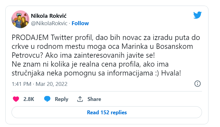 – Prodajem Tviter profil, dao bih novac za izradu puta do crkve u rodnom mestu mog oca Marinka u Bosanskom Petrovcu. Ako ima zainteresovanih, javite se. Ne znam ni kolika je realna cena profila, ako ima stručnjaka, neka pomognu sa informacijama. Hvala – napisao je on tada.