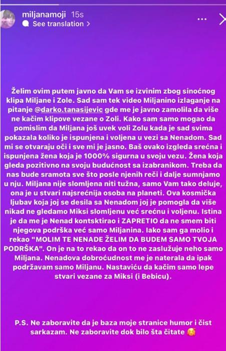 Na jednoj od fan stranica posvećenih Miljani, odmah nakon nje se oglasio i administrator i napisao na svom storiju zvanično obaveštenje, ali uz podsećanje da je njegova stranica napravljena u svrhu humora, zabave, ali i sarkazma, pa je u skladu sa tim bilo i saopštenje koje možete pročitati na slici ispod: