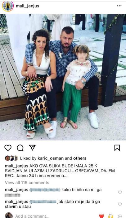 – Ako ova slika bude imala 25 hiljada lajkova ulazim u Zadrugu… Obećavam, dajem reč, tačno 24 časa ima vremena – napisao je Janjuš uz fotografiju svoje bivše supruge Ene i njihove ćerke Krune.