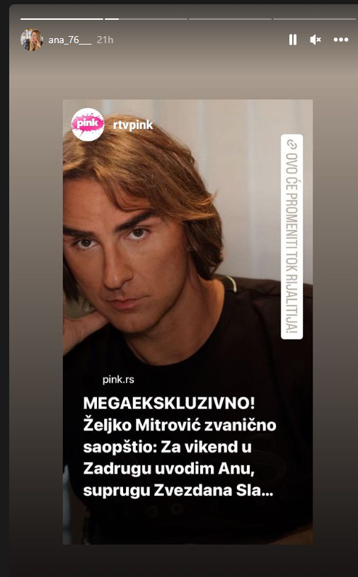 Vlasnik televizije Pink Željko Mitrović juče je zvanično objavio na svom Instagramu da će se u šestu sezonu “Zadruge” ovog vikenda useliti bivša žena Zvezdana Slavnića, Ana.