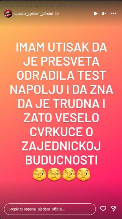 Očekivano, ova tema je izazvala mnoštvo komentara kako u Beloj kući, tako i u spoljnom svetu, a pojedinci idu toliko daleko, da su počeli da sumnjaju da je Đuričićeva izašla iz “Zadruge”, uradila test na trudnoću koji je navodno pokazao da je u drugom stanju, pa je upravo zbog toga toliko sigurna kada priča o ovoj temi.