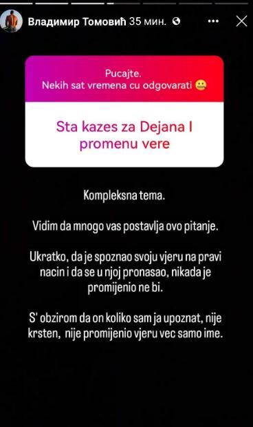 Bivši rijaliti učesnik, Vladimir Tomović, odgovarao je na pitanja nadruštvenoj mreži te je jedno od postavljenih bilo vezano i za Dejana Dragojevića, pobednika pete sezone Zadruge, koji se nedavno izjasnio da je već četiri godine u Islamu.