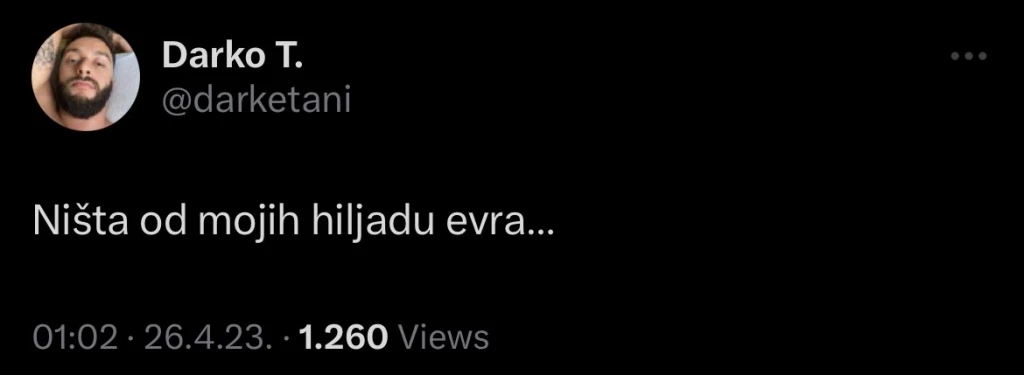 – Ništa od mojih hiljadu evra… – napisao je Darko na Tviteru.