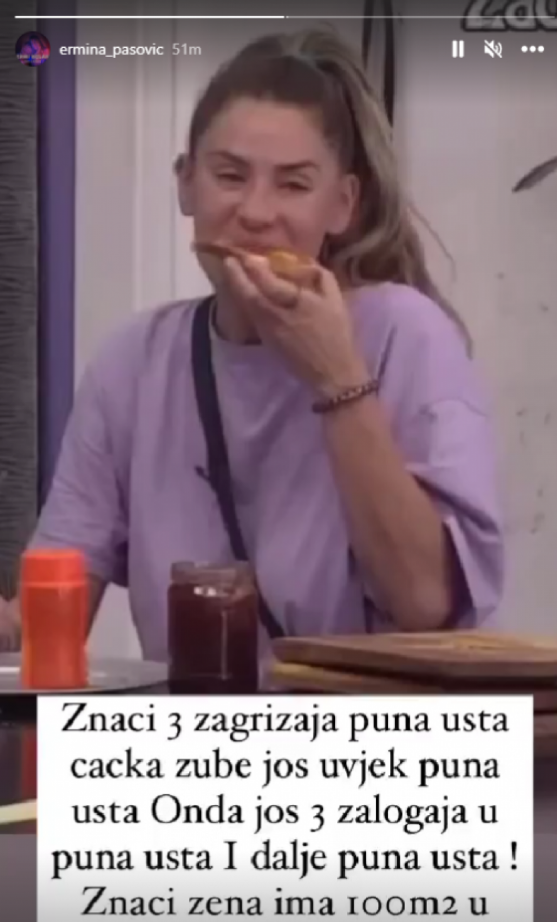 – Znači, 3 zagrizaja, puna usta, onda čačka zube, pa još 3 zalogaja… Žena ima 100m2 u ustima – napisala je Ermina.