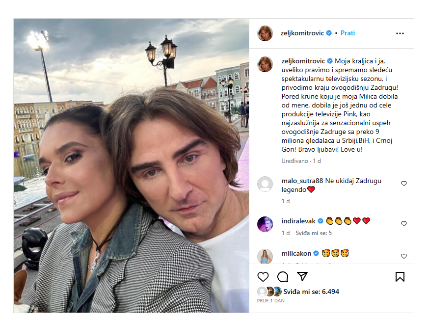 – Pored krune koju je moja Milica dobila od mene, dobila je još jednu od cele produkcije televizije Pink, kao najzaslužnija za senzacionalni uspeh ovogodišnje “Zadruge” sa preko 9 miliona gledalaca u Srbiji, Bosni i Hercegovini i Crnoj Gori! Bravo ljubavi! Volim te – poručio je Mitrović.