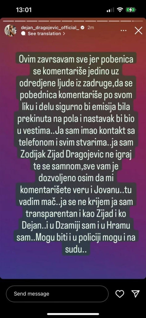 – Pobednica se komentariše jedino uz ostale zadrugare, da se komentariše po svom liku i delu, sigurno bi emisija bila prekinuta na pola i nastavak bi bio u vestima. Ja sam Zodijak Zijad Dragojević, ne igrajte se sa mnom, sve vam je dozvoljeno, osim da mi komentarišete veru i Jovanu. Tu vadim mač. Ja sam transparentan i kao Zijad i kao Dejan, i u Džamiji sam i u Hramu sam, mogu biti i u policiji, i na sudu – rekao je Dejan.
