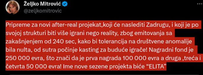 – Pripreme za novi after-real projekat, koji će naslediti Zadrugu, i koji je po svojoj strukturi biti više igrani nego reality, zbog emitovanja sa zakašnjenjem od 240 sec, kako bi tolerancija na društvene anomalije bila nulta, od sutra počinje kasting za buduće igrače! Nagradni fond je 250 000 evra, što znači da je prva nagrada 100 000 evra a druga, treća i četvrta 50 000 evra! Ime nove sezene projekta biće “ELITA” – stoji u objavi televizijskog maga.