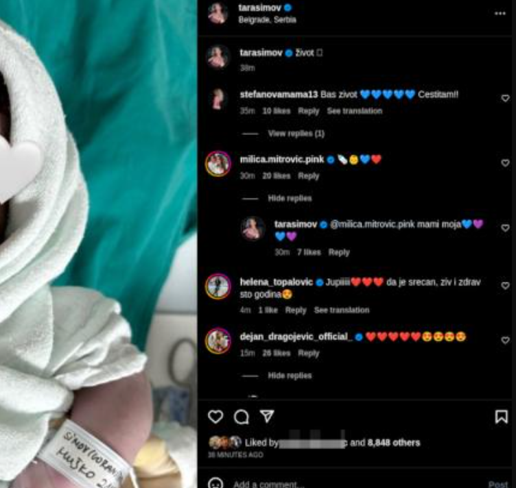 Nakon toga, ona je istu fotografiju objavila i na svom profilu, a čestitke u komentarima ne prestaju da stižu. Među javnim ličnostima koje su Tari odmah čestitale što je postala mama su Milica Dabović, Helena Topalović, Dejan Dragojević, Milan Milošević, Marko Đedović, ali i Velika šefica, Milica Mitrović.