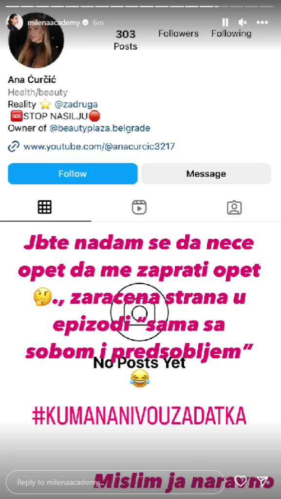 – Nadam se da neće opet da me zaprati zaraćena strana u epizodi “sama sa sobom i predsobljem” – napisala je Milena, pa dodala da je ona na novou zadatka.