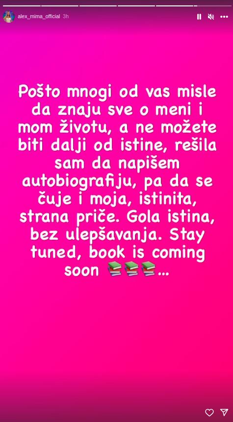 – Pošto mnogi od vas misle da znaju sve o meni i mom životu, a ne možete biti dalji od istine, rešila sam da napišem autobiografiju, pa da se čuje i moja istinita strana priče. Gola istina, bez ulepšavanja. Knjiga stiže uskoro – otkrila je Aleksandra.