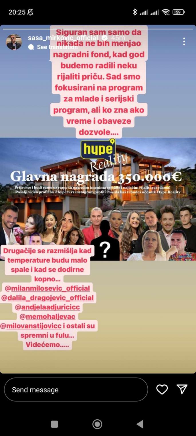 – Siguran sam damo da nikada ne bih menjao nagradni fond, kad god budem radio neku rijaliti priču. Sad smo fokusirani na program za mlade i serijski program, ali ko zna ako vreme i obaveze dozvole – istakao je vlasnik “Hypa”, pa dodaje: