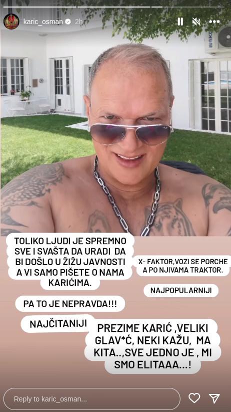 U jeku skandala u čijoj žiži se našao njegov sin Stefan Karić, kada ga je starleta i nekadašnja učesnica rijalitija “Parovi” Nataša Šavija optužila za navodno prebijanje, Osman Karić se oglasio sa specifičnom Instagram pričom, koja je mnoge oduševila, a moglo bi se reći da je dvosmislena.