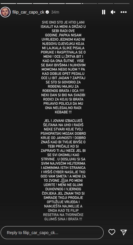 – Je l’ i Jovani izbacuješ šejtana na uvo i radiš neke stvari, koje tvoj psihopatski mozak dobro krije od javnosti? Dobro znaš da, kad bi tvoje bivše o tebi pričale ko si zapravo ti, ali neće, jer bi se onda svi okomili kao strvine, jer si u dosluhu sa adminima istih stranica i vršiš sajber nasilje. A meni za to zvone ja*a, po meni udrite, ali mi ne glumi duhovnog i vernog čoveka, jer znam ko si, smrade, koji prodaje, optužuje, vređa i namešta najmilije. A kad te Filip resetuje, glumiš sina i brata – napisao je Filip.
