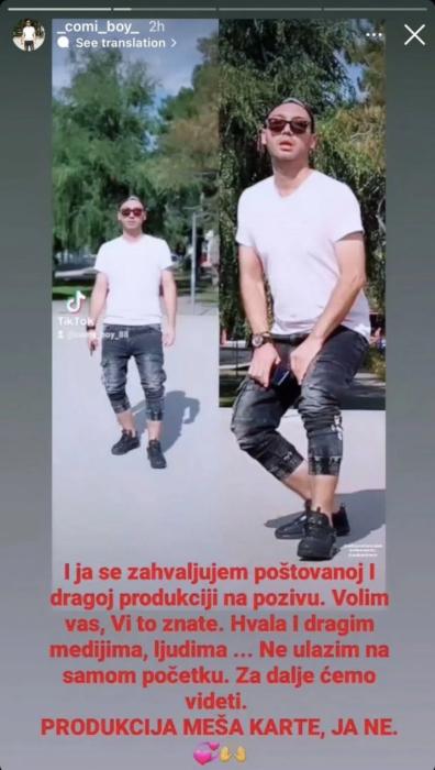 – I ja se zahvaljujem poštovanoj i dragoj produkciji na pozivu. Volim vas, vi to znate. Hvala i dragim medijima, ljudima… Ne ulazim na samom početku. Za dalje ćemo videti. Produkcija meša karte, ja ne – napisao je Mića na Instagramu.