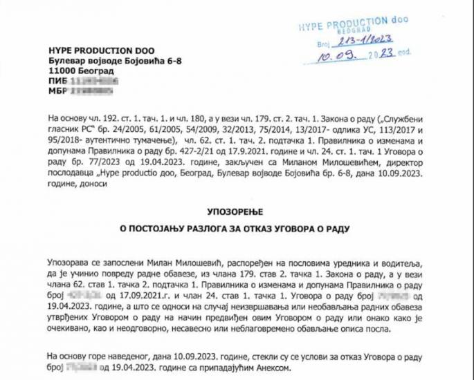 No sada je objavljen i zvanični dokument kojim se dokazuje da je Milan Milošević dobio upozorenje pred uručenje otkaza, kako je navedeno, zbog neispunjavanja radnih obaveza i kršenja odredaba ugovora o radu kojim je zasnovana saradnja sa Hajp produkcijom.