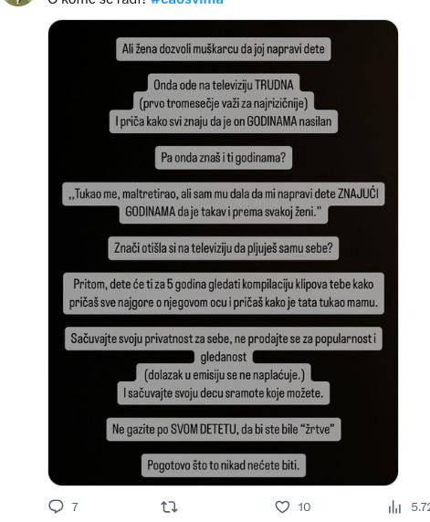 – Ali žena dozvoli muskarcu da joj napravi dete, a onda ode na televizju trudna (prvo tromesečje važi za najrizičnije) i priča kako svi znaju da je on godinama nasilan. Pa onda znaš i ti godinama? “Tukao me, maltretirao, ali sam mu dala da mi napravi dete znajući da je godinama takav prema svakoj ženi.” Znači, otišla si na televiziju da pljuješ samu sebe? Pritom, dete će ti za 5 godina gledati kompilaciju klipova tebe kako pričas sve najgore o njegovom ocu i pričas kako je tata tukao mamu. Sačuvajte svoju privatnost za sebe, ne prodajte se za popularnost i gledanost (dolazak u emisiju se ne naplaćuje). Sačuvajte svoju decu sramote koje možete. Ne gazite po svom detetu, da bi ste bili “žrtve”, pogotovo što to nikad nećete biti – stoji u objavi.