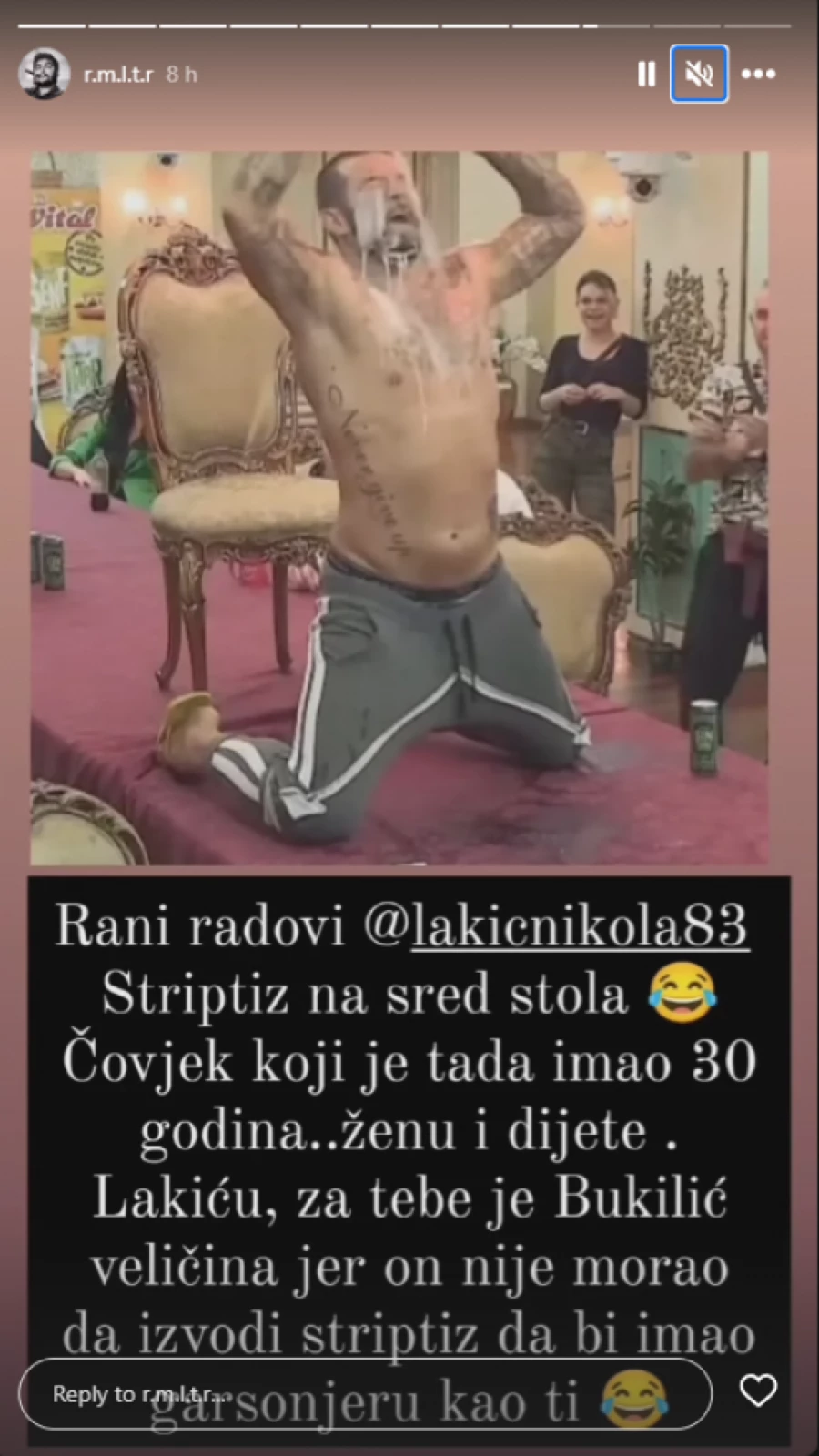 – Rani radovi Nikole Lakića. Striptiz nasred stola. Čovek koji je tada imao 30 godina, ženu i dete. Lakiću, za tebe je Bukilić veličina, jer on nije morao da izvodi striptiz da bi imao garsonjeru kao ti – stoji na fotografiji koja je objavljena na Instagram stranici.