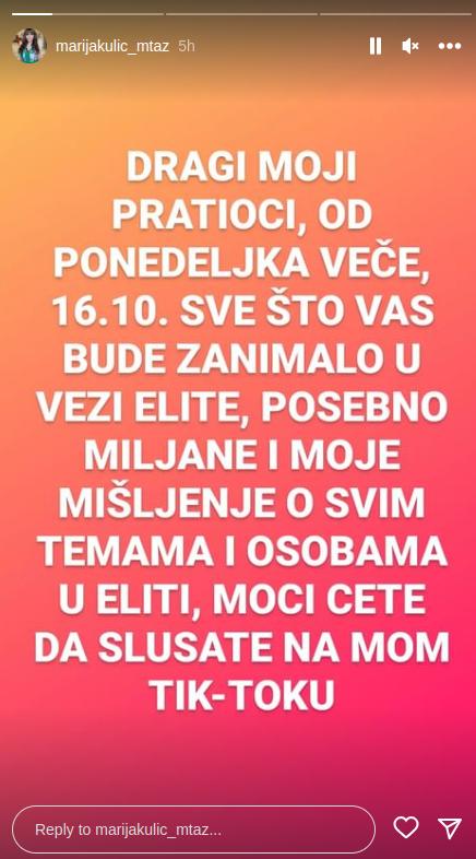 – Dragi moji pratioci, od ponedeljka veče 16.10 sve što vas bude zanimalo u vezi Elite, posebno Miljane i moje mišljenje o svim temama i osobama u Eliti, moći ćete da slušate na mom TikToku – napisala je Marija Kulić na svom profilu.