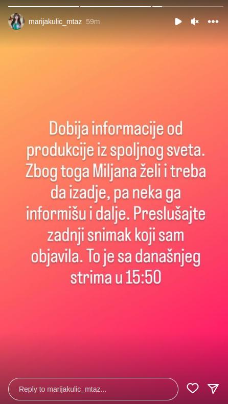 – Dobija informacije od produkcije iz spoljnog sveta. Zbog toga Miljana želi i treba da izađe, pa neka ga informišu i dalje. Poslušajte zadnji snimak koji sam objavila. To je sa današnjeg strima u 15:50 – napisala je Marija u objavi.