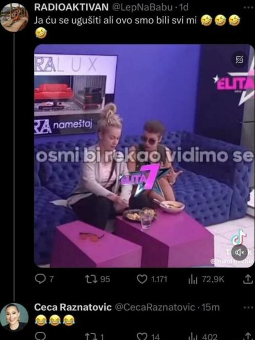 Povodom ove situacije na društvenoj mreži Tviter oglasila se i Ceca koja je ispod pomenutog klipa ostavila emotikone koji plaču od smeha.