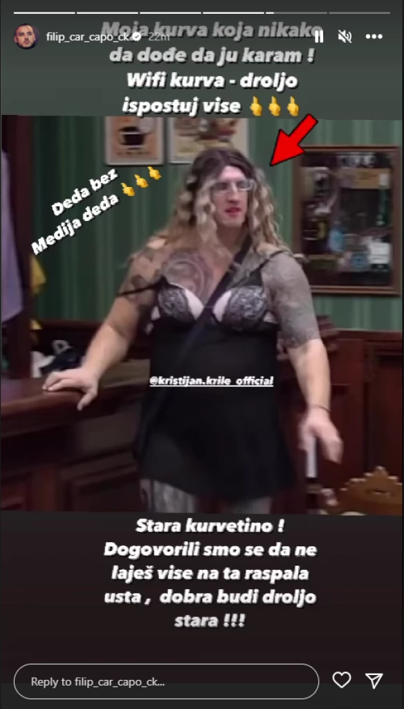Filip je odlučio da uzvrati na Kristijanove uvrede, pa je na svoj stori na društvenoj mreži Instagram okačio sliku kad se Golubović jednom prilikom maskirao u ženu i uz to dodao nekoliko reči, u svom stilu.