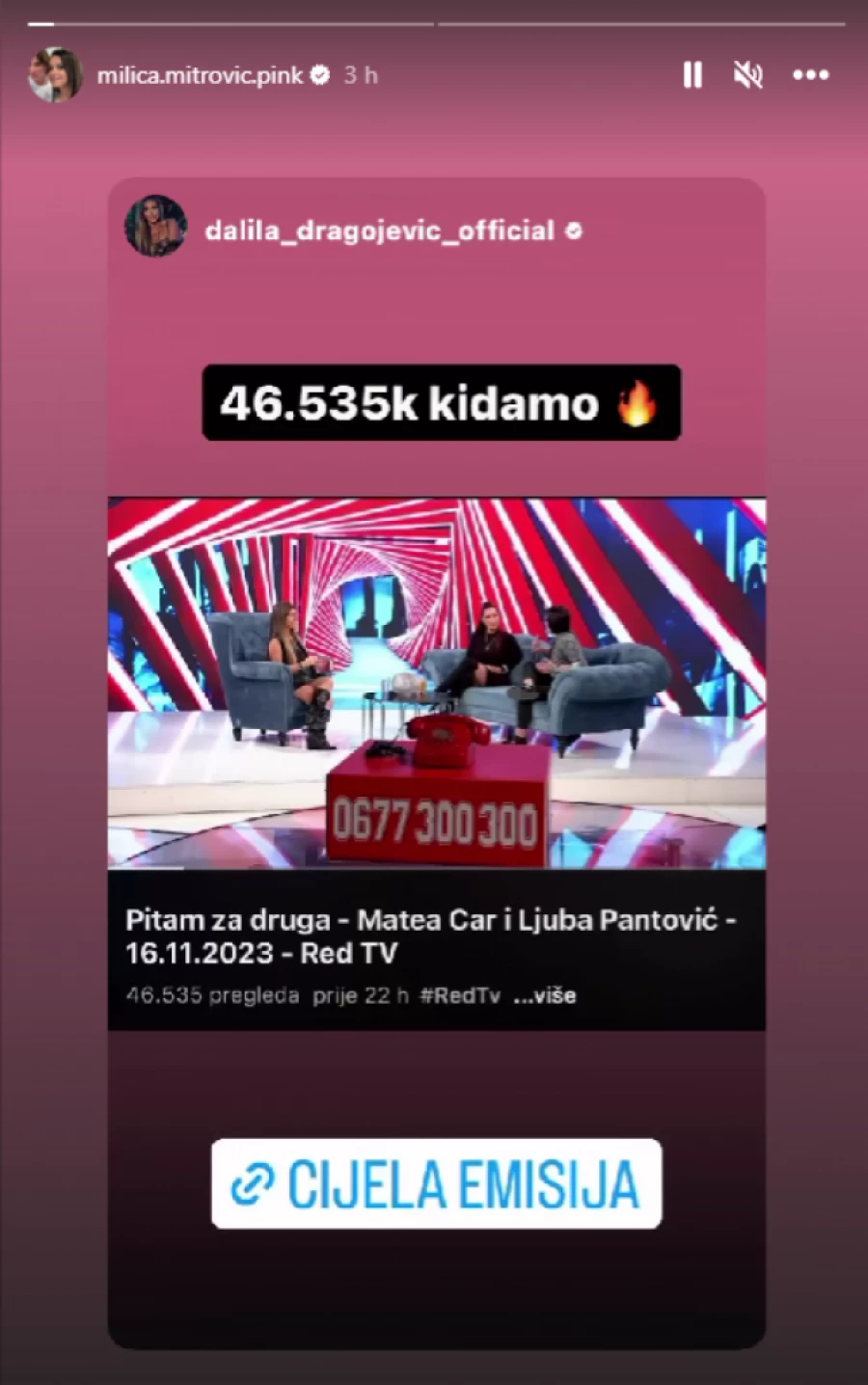 Naime, Milica je na Instagram profilu podelila Dalilin Instagram stori na kom je pokazala brojke kojima se pohvalila iz emisije u kojoj je gostovala Matea.
