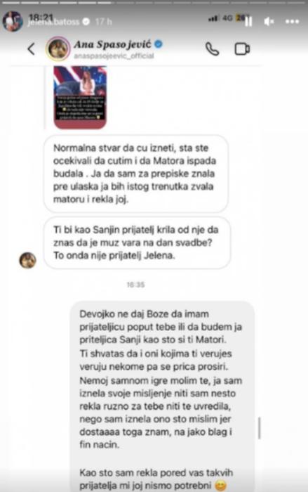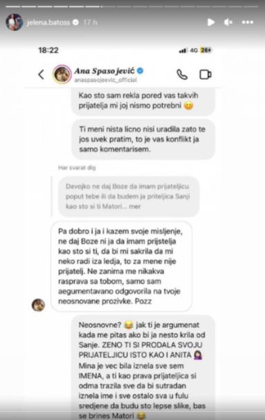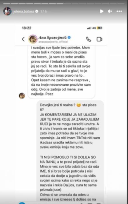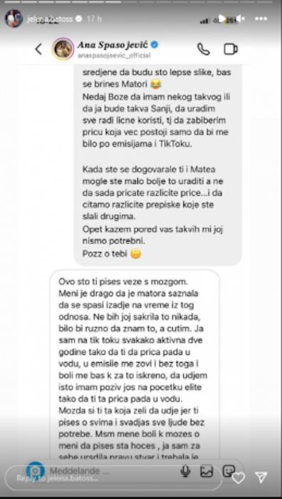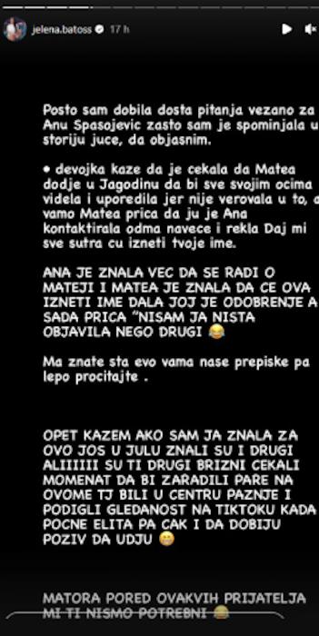 – Pošto sam dobila dosta pitanja vezano za Anu Spasojević, zašto sam je spominjala u storiju juče, pa da objasnim. Devojka kaže da je čekala da Matea dođe u Jagodinu da bi sve svojim očima videla i uporedila, jer nije verovala u to, a ovamo Matea priča da ju je Ana kontaktirala odmah naveče i rekla: ,,Daj mi sve, sutra ću izneti tvoje ime”. Ana je znala već da se radi o Matei i Matea je znala da će ova izneti ime, dala joj je odobrenje, a sada priča: ,,Nisam ja ništa objavila, nego drugi”. Ma znate šta, evo vama naše prepiske pa lepo pročitajte – napisala je Jelena i dodala:
