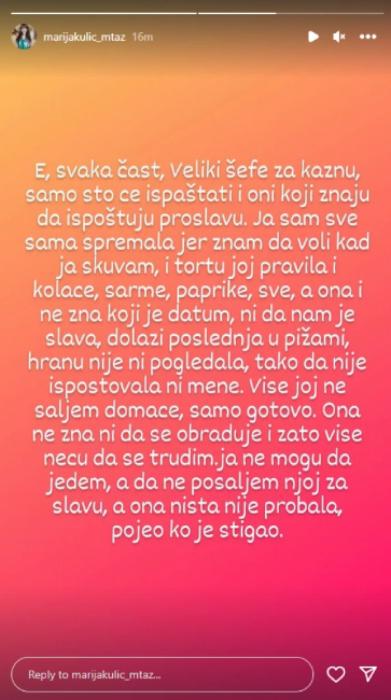 – E svaka čast, Velike šefe, za kaznu, samo što će ispaštati i oni koji znaju da ispoštuju proslavu. Ja sam sve sama spremala jer znam da voli kad ja skuvam, i tortu joj pravila i kolače, sarme, paprike, sve, a ona i ne zna koji je datum, ni da nam je slava. Dolazi poslednja u pidžami, hranu nije ni pogledala, tako da nije ispoštovala ni mene. Više joj ne šaljem domaće, samo gotovo. Ona ne zna ni da se obraduje i zato više neću da se trudim. Ja ne mogu da jedem, a da ne pošaljem njoj za slavu, a ona ništa nije probala, pojeo ko je stigao – napisala je Marija na svom profilu na društvenoj mreži Instagram.
