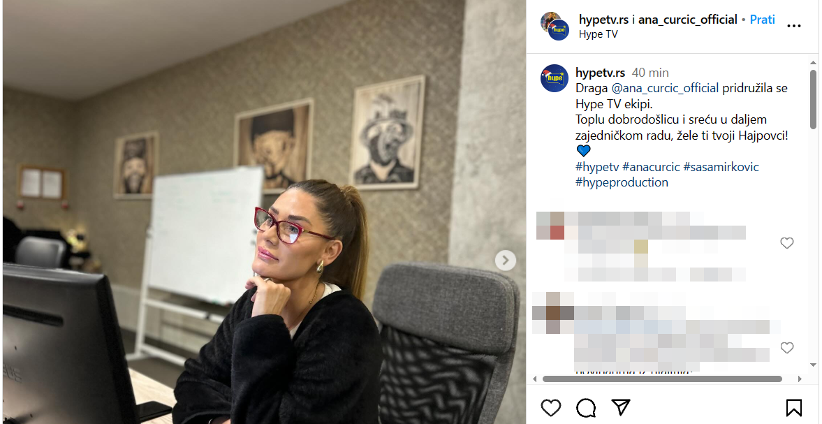 – Draga Ana Ćurčić pridružila se “Hajp” TV ekipi. Toplu dobrodošlicu i sreću u daljem zajedničkom radu, žele ti tvoji Hajpovci! – istaknuto je uz fotografiju rijaliti zvezde na radnom mestu.