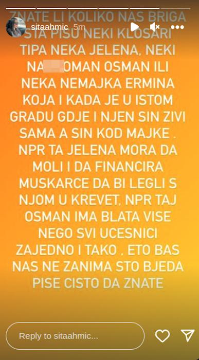 – Znate koliko nas briga šta pišu neki klošari, tipa neka Jelena, neki nark*man Osman ili neka nemajka Ermina koja i, kada je u istom gradu gde je i njen sin, živi sama, a sin kod majke. Npr. ta Jelena mora da lovi i da finansira muškarce da bi legli s njom u krevet. Npr. taj Osman ima blata nego više nego učesnici zajedno i tako dalje. e tako, baš nas ne zanima što beda piše. Čisto da znate – napisala je Sita