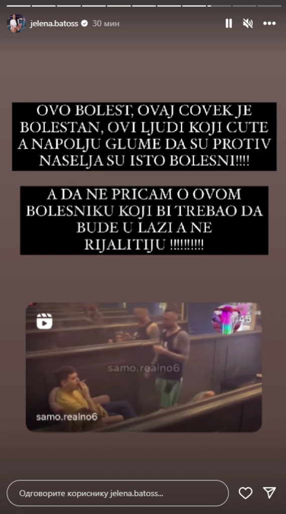 – Ovo bolest, ovaj čovek je bolestan, ovi ljudi koji ćute, a napolju glume da su protiv nasilja su isto bolesni!!!! A da ne pričam o ovom bolesniku, koji bi trebalo da bude u Lazi, a ne u rijalitiju!!!! – poručila je Jelena putem storija na društvenoj mreži Instagram.