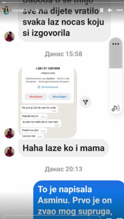 – To je napisala Asminu. Prvo je on zvao mog supruga, pa mu je on dao Miljanin broj. Nije mogla da se javi, pa ga je pozvala kasnije i rekla da ne govori Zoli jer ga Zola laže da se vraća i da će on da brani Aneli – glasila je poruka koju je Marija napisala profilu koji ju je napao da su Miljana i ona lažovi, a onda dodala: