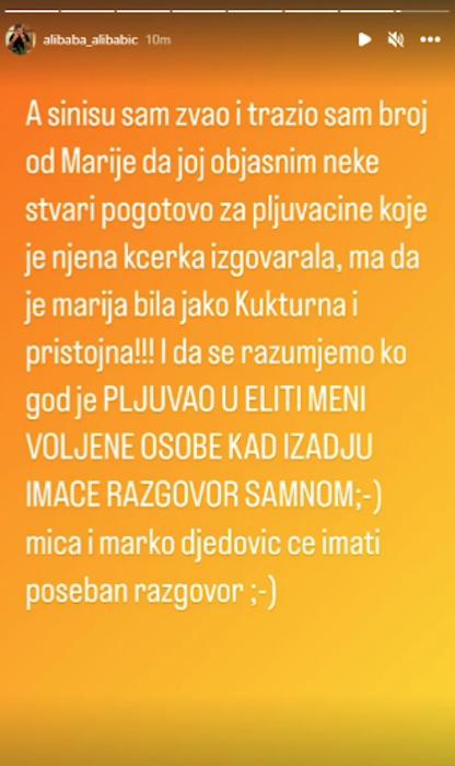 – A Sinišu sam zvao i tražio sam broj od Marije da joj objasnim neke stvari pogotovo za pljuvačine koje je njena kćerka izgovarala. Mada je Marija bila jako kulturna i pristojna. I da se razumemo ko god je pljuvao u “Eliti” meni voljene osobe kad izađu imaće razgvoor sa mnom. Mića i Marko Đedović će imati poseban razgovor – poručio je Durdžić putem svog profila na Instagramu.