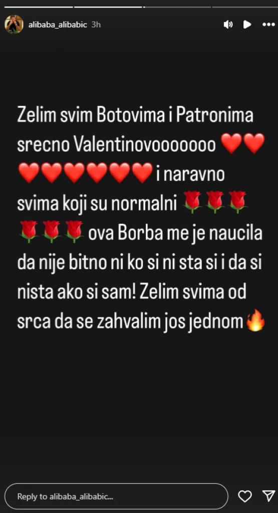 – Želim svim Botovima i Patronima srećno Valentinovo. I naravno svima kpoji su normalni. Ova borba me je naučila da nije bitno ni ko si, ni šta si ništa, ako si sam! Želim svima od srca da se zahvalim još jednom – napisao je Asmin, a onda objasnio šok video.