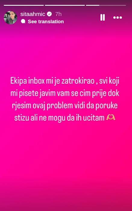– Ekipa, inboks mi je zatrokoirao, svi koji mi pišete, javljam vam se čim pre rešim ovaj problem. Vidim da mi poruke stižu ali ne mogu da ih slušam – dodala je Ahmićeva i stavila emotikon srca u znak podrške onima koji žele da joj pomognu.