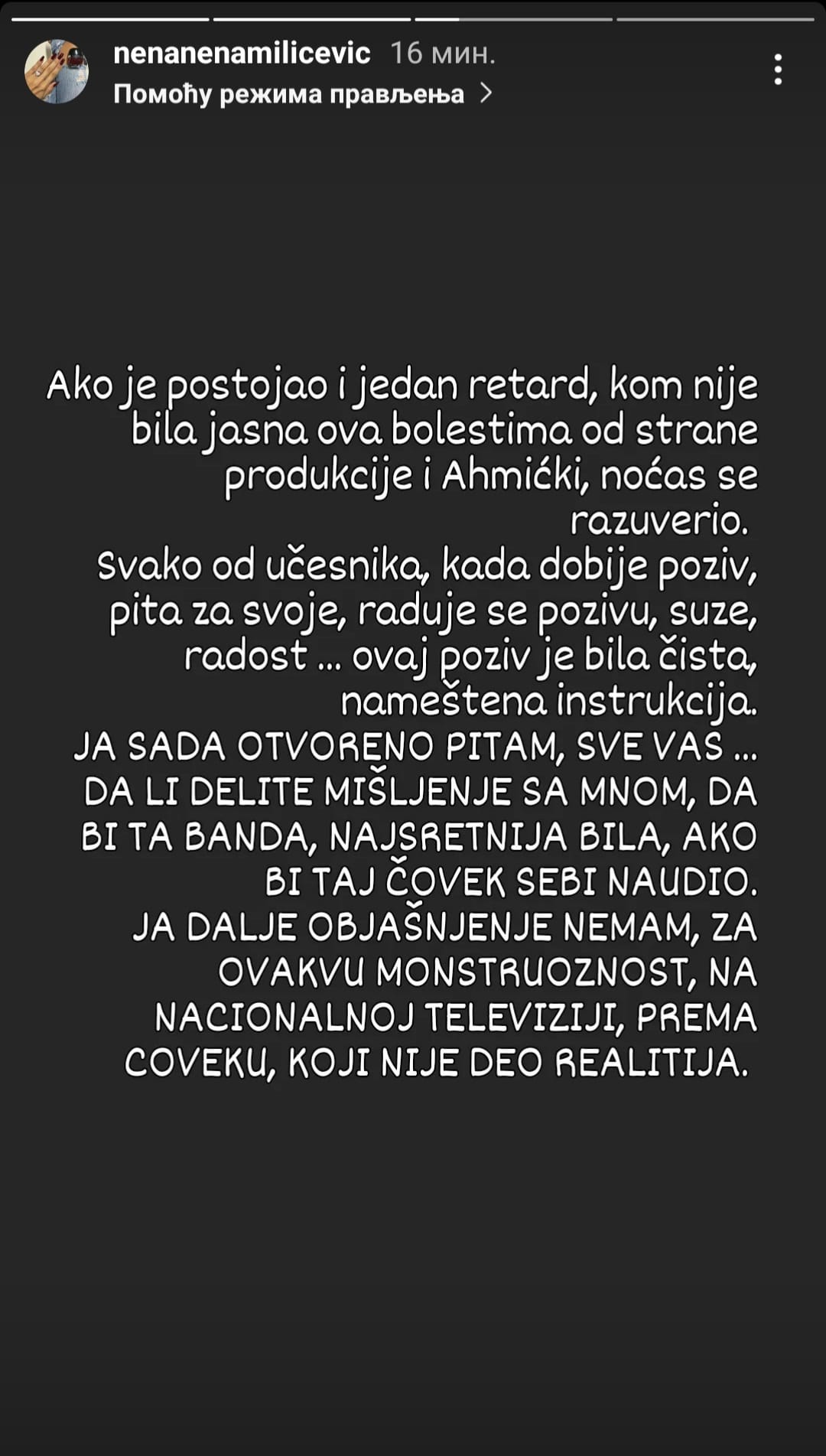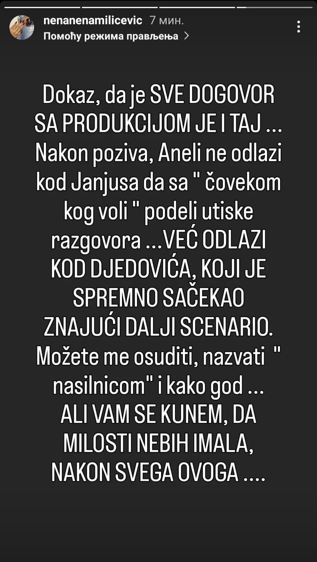 Nema toga. Imaš nenormalnu podršku, nisi ni svesna toga, moraš da se ponašaš kao favorit. Svi ljudi koji te vređaju, imaće tužbe. Asmin je rekao da sam ja snjim na porniću, je l’ ti znaš kako ije meni?! Aneli, Asmin je pustio pornić s muškarcem – rekla je Sita.