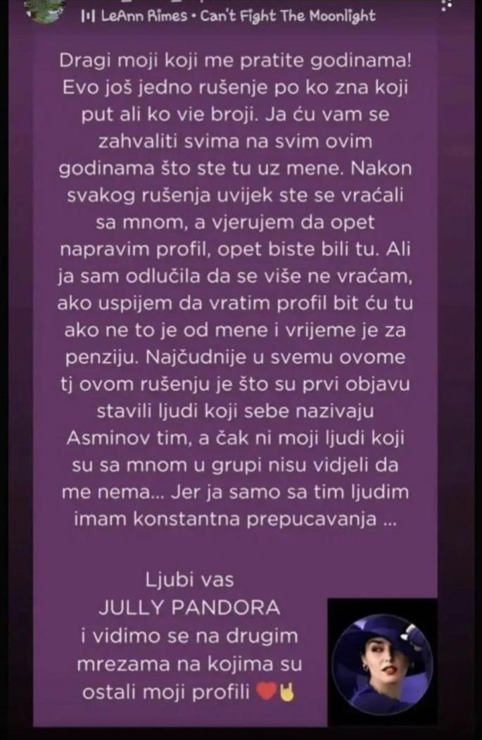 – Dragi moji, koji me pratite godinama! Evo još jedno rušenje, po ko zna koji put, ali ko više broji. Ja ću vam se zahvaliti svima na svim ovim godinama što ste tu uz mene. Nakon svakog rušenja uvek ste se vraćali sa mom, a verujem da opet napravim profil, opet biste bili tu. Ali ja sam odlučila da se više ne vraćam, ako uspem da vratim profil, biću tu, ako ne – to je od mene i vreme je za penziju. Najčudnije u svemu ovome, tj. ovom rušenju je što su prvi objavu stavili ljudi koji sebe nazivaju Asminov tim, a čak ni moji ljudi koji su sa mom u grupi nisu videli da me nema… Jer ja samo sa tim ljudima imam konstantna prepucavanja. Ljubi vas Jully Pandora i vidimo se na drugim mrežama, na kojima su ostali moji profili – stoji u zvaničnom saopštenju.