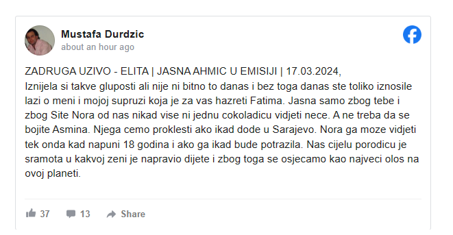 – Iznela si takve gluposti, ali nije ni bitno to danas i bez toga ste toliko iznosile laži o meni i mojoj supruzi, koja je za vas hazreti Fatima. Jasna, samo zbog tebe i zbog Site, Nora od nas nikad više ni jednu čokoladicu videti neće. Ne treba da se bojite Asmina. Njega ćemo proklesti ako ikad dođe u Sarajevo. Nora ga može videti tek onda kad napuni 18 godina i ako ga ikad bude potražila. Nas, celu porodicu, je sramota kakvoj ženi je napravio dete i zbog toga se osećamo kao najveći ološ na ovoj planeti – napisao je Mustafa na svom Fejsbuk nalogu, što možete videti u nastavku: