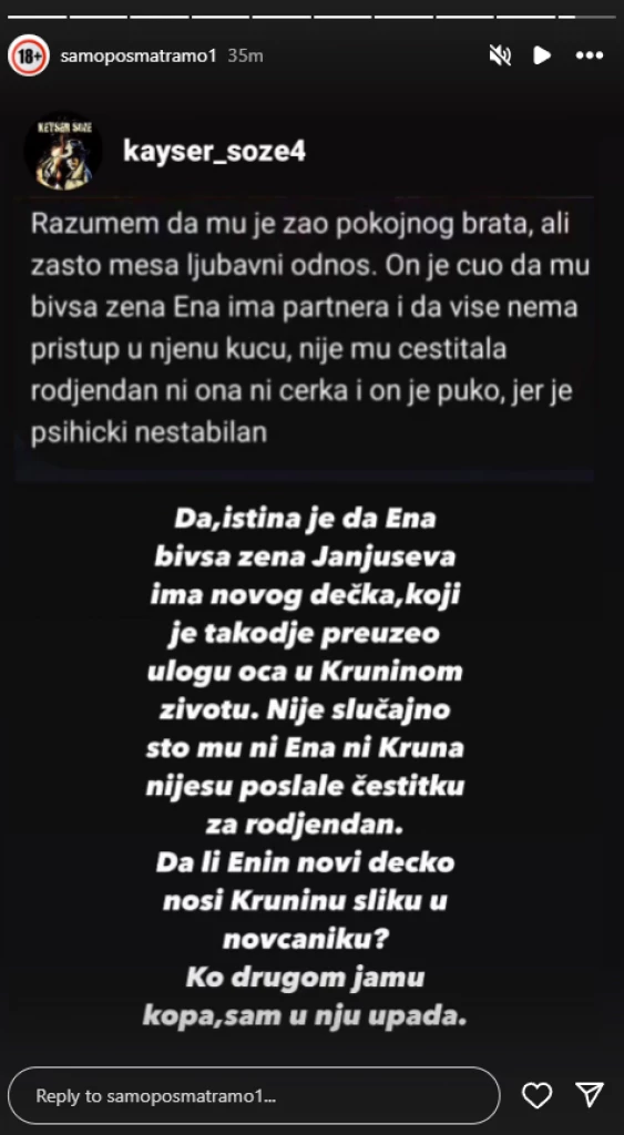 – Da, istina je da Ena bivša žena Janjuševa ima novog dečka, koji je takođe preuzeo ulogu oca u Kruninom životu. Nije slučajno što mu ni Ena, ni Kruna nisu poslale čestitku za rođendan. Da li enin novi dečko nosi Kruninu sliku u novčaniku? Ko drugome jamu kopa, sam u nju pada – glasio je komentar tog profila na Instagramu.