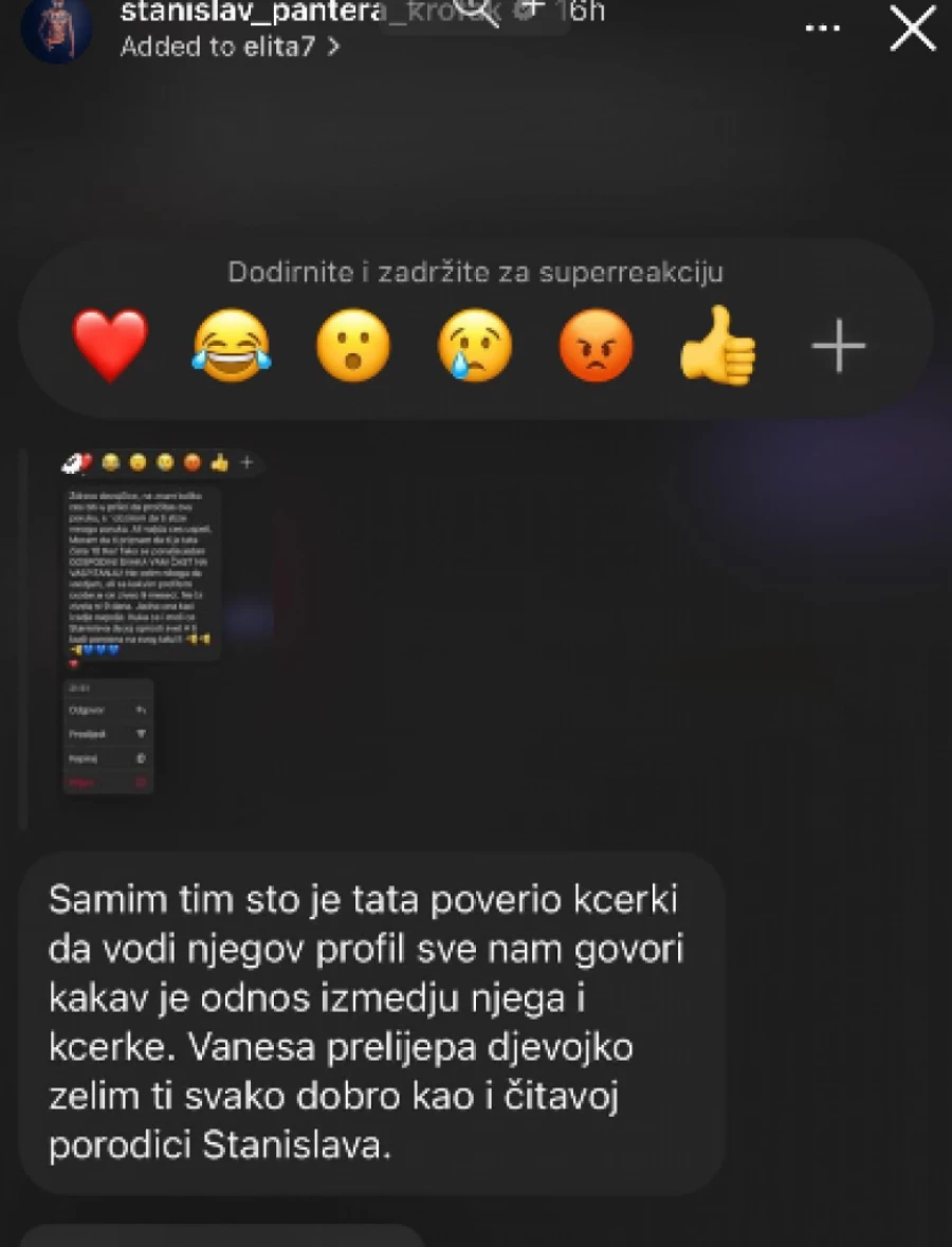 – Samim tim što je tata poverio ćerki da vodi njegov profil sve nam govori kakav je odnos između njega i ćerke. Vanesa, prelepa devojko, želim ti svako dobro, kao i čitavoj porodici Stanislava – glasila je poruka koje je objavljena na Instagram storiju.