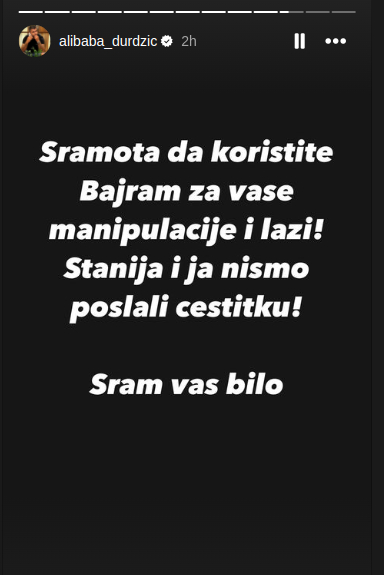 – Sramota da koristite Bajram za vaše manipulacije i laži! Stanija i ja nismo poslali čestitku! Sram vas bilo – napisao je Asmin.