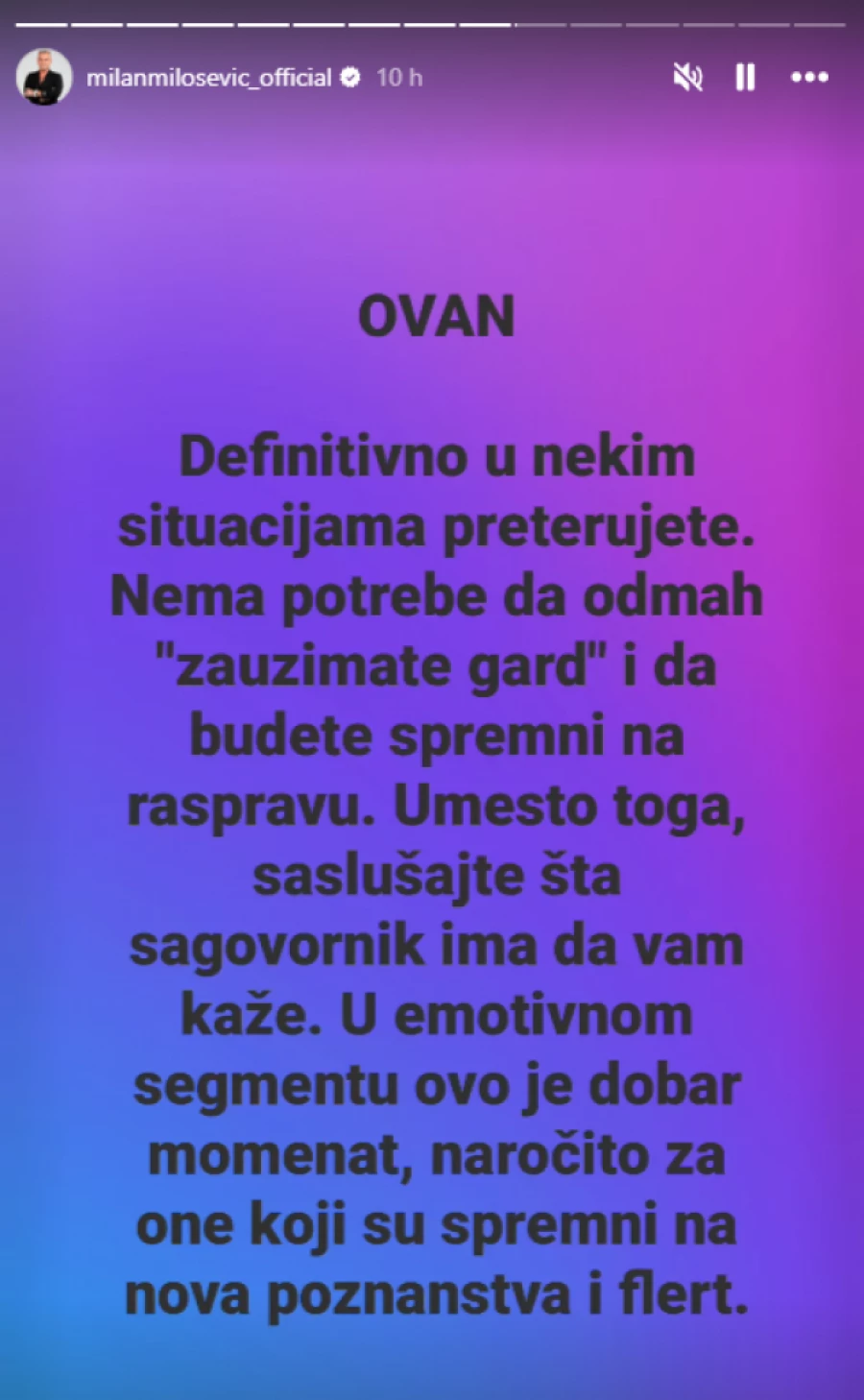 – Definitivno u nekim situacijama preterujete. Nema potrebe da odmah ,,zauzimate gard” i da budete spremni na raspravu. Umesto toga, saslušajte šta sagovornik ima da vam kaže. U emotivnom segmentu ovo je dobar momenat, naročito za one koji su spremni na nova poznanstva i flert – glasi poruka koju je Milan Milošević napisao na Instagramu.