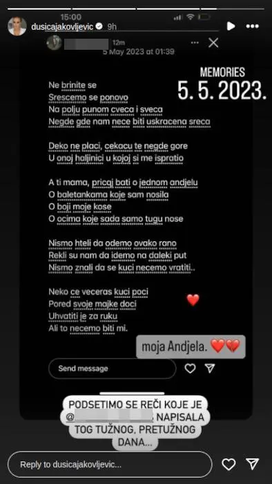 Tog 3. maja 2023. godine čitava Srbija je zanemela od bola i tuge, zbog nezapamćenog zločina, a sećanje na nedužne žrtve živeće večno. Dušica je na godišnjicu ove stravične tragedije objavila stihove koje je njena ćerka posvetila ubijenoj deci, i svima naterala suze na oči.