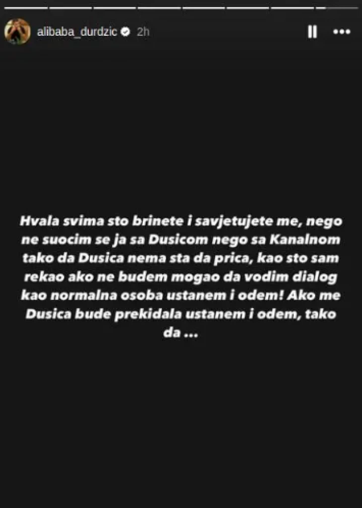 – Kao što sam rekao, ako ne budem mogao da vodim dijalog kao normalna osoba, ustanem i odem! Ako me Dušica bude prekidala, ustanem i odem, tako da… – poručio je Durždić putem storija na društvenoj mreži Instagram.