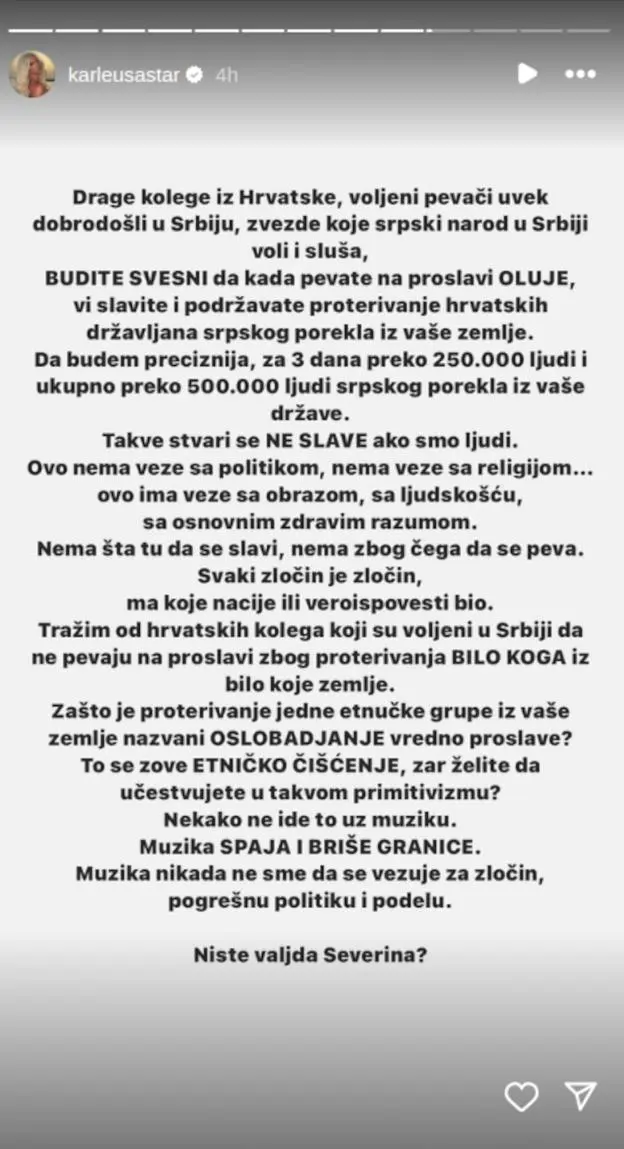 – Svaki zločin je zločin, ma koje nacije i veroispovesti bio. Tražim od hrvatskih kolega koji su voljeni u Srbiji, da ne pevaju na proslavi zbog proterivanja bilo koga iz bilo koje zemlje. Zašto je proterivanje, jedne etničke grupe iz vaše zemlje nazvano oslobađanje, vredno proslave? To se zove etničko čišćenje, zar želite da učestvujete u takvom primitivizmu? Nekako ne ide to uz muziku. Muzika spaja i briše granice. Muzika nikada ne sme da se vezuje za zločin, pogrešnu politiku i podelu. Niste valjda Severina? – zaključila je Karleuša.